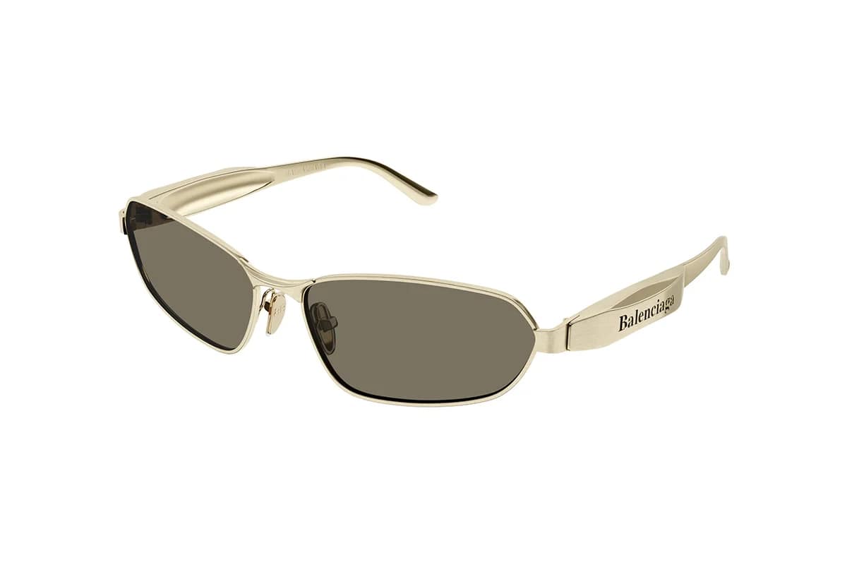 Occhiali da sole Balenciaga BB0355S 002 Gold Brown (Misura 66-17-135) Linea Everyday. Montatura unisex dalla forma cat-eye stretta realizzata in metallo oro con lenti uniformi in bio nylon marrone. Nuovo modello con aste dal design originale caratterizzate da un importante placca tridimensionale in corrispondenza della cerniera con logo inciso e smaltato.