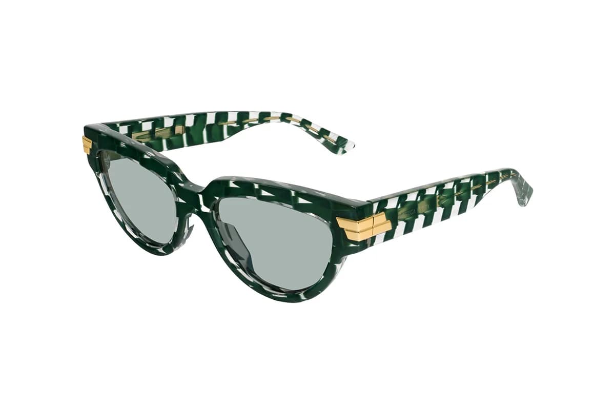 Occhiali da sole Bottega Veneta BV1035S 008 Green (Misura 55-19-145) Linea Unapologetic. Montatura donna dalla forma cat-eye morbida realizzata in acetato riciclato verde irregolare con lenti flashate in bio nylon verde. Modello impreziosito dal nuovo iconico motivo a strisce sfrangiate tridimensionale in metallo sulle aste. Superfici dal design ben definito grazie al processo di fabbricazione artigianale. Logo tono su tono inciso al laser all’esterno dell’asta sinistra. Dettagli antiscivolo all’interno dei terminali.