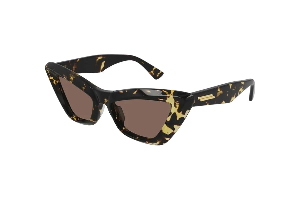 Occhiali da sole Bottega Veneta BV1101S 002 (misura 53-17-140). Montatura Donna realizzata in Acetato color Shiny Spotted Havana con lenti in CR-39. Occhiali da sole cat-eye ideali per un viso a cuore, a diamante, ovale.