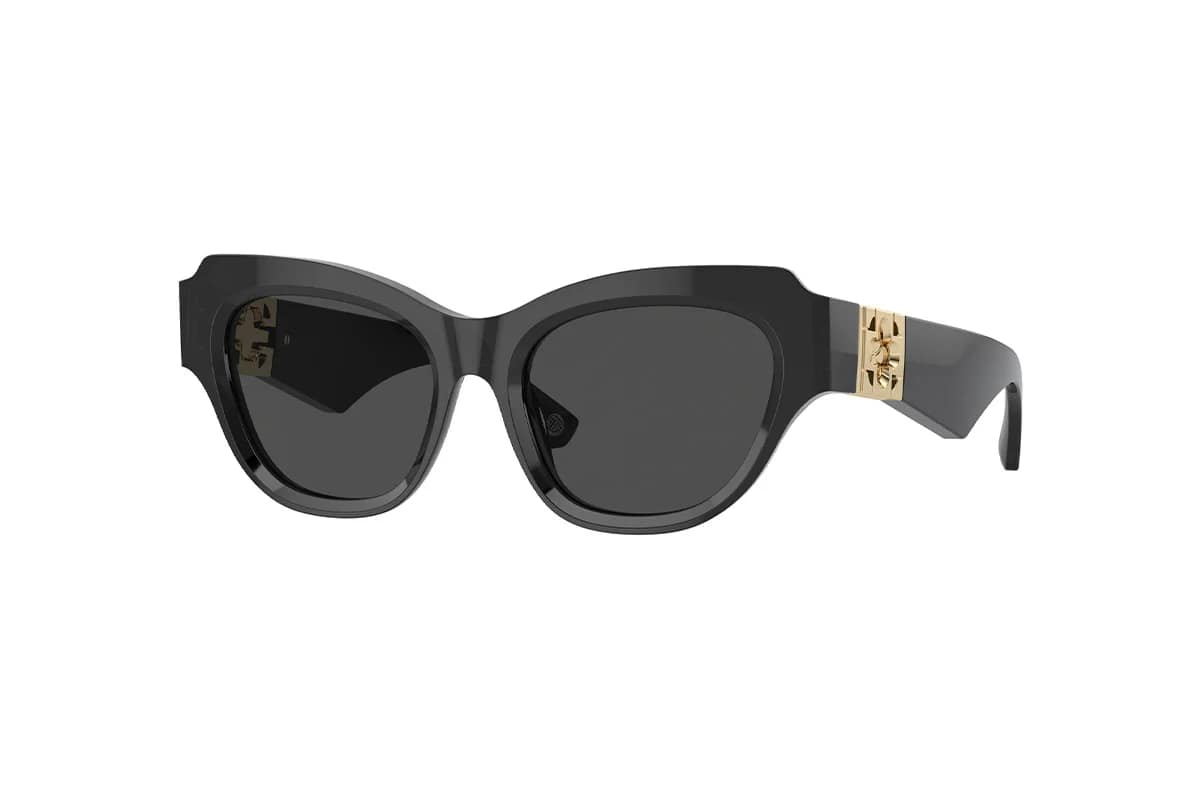 Occhiali da sole Burberry BE4423 411287 (Misura 52-18-130). Montatura cat-eye da donna realizzata in acetato grigio scuro con lenti in Poliammide Bio grigio (categoria 3). La pratica cerniera in metallo a forma di rosa diventa il punto focale di questo design oversize.