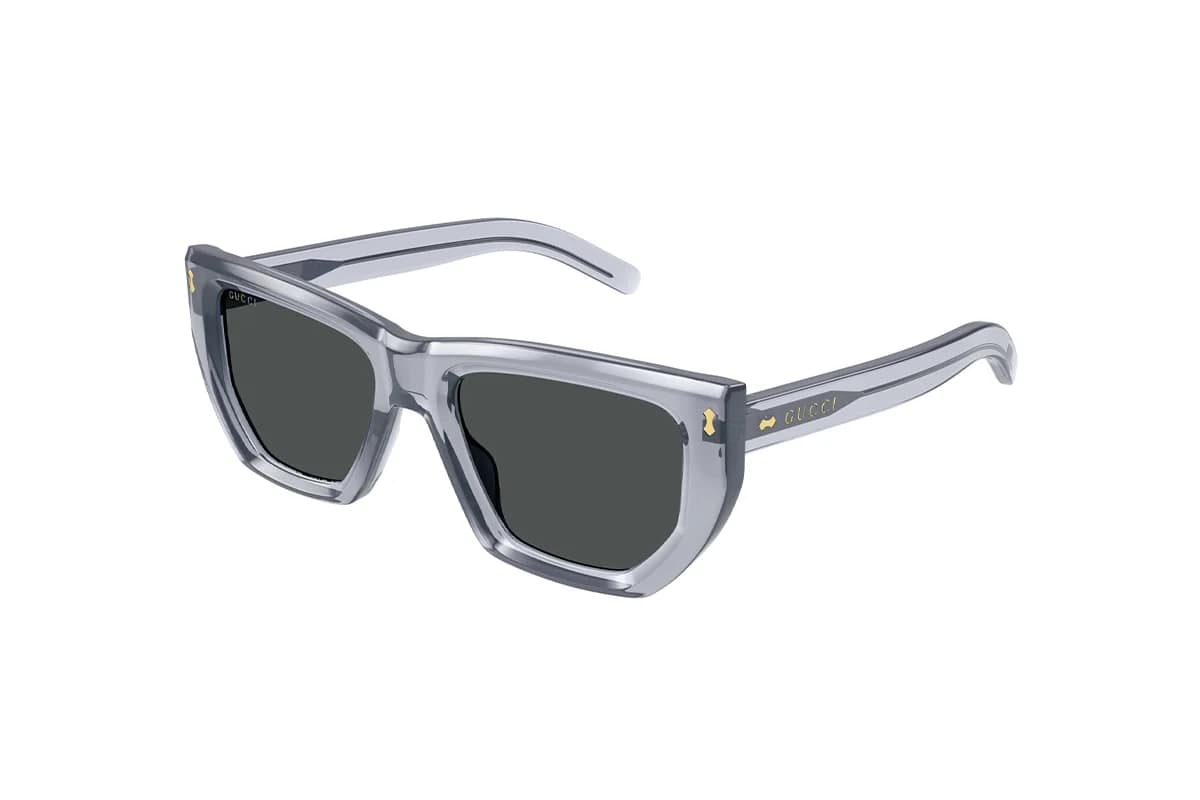Occhiali da sole Gucci GG1520S 004 (misura 53-19-145) linea Rivets. Montatura donna realizzata in Acetato Riciclato color Grigio trasparente con lenti in Nylon. Occhiale da sole geometrica ideale per un viso rotondo, a cuore, ovale. Un modello elegante e senza tempo impreziosito dagli iconici rivetti Gucci e logo sulle aste.