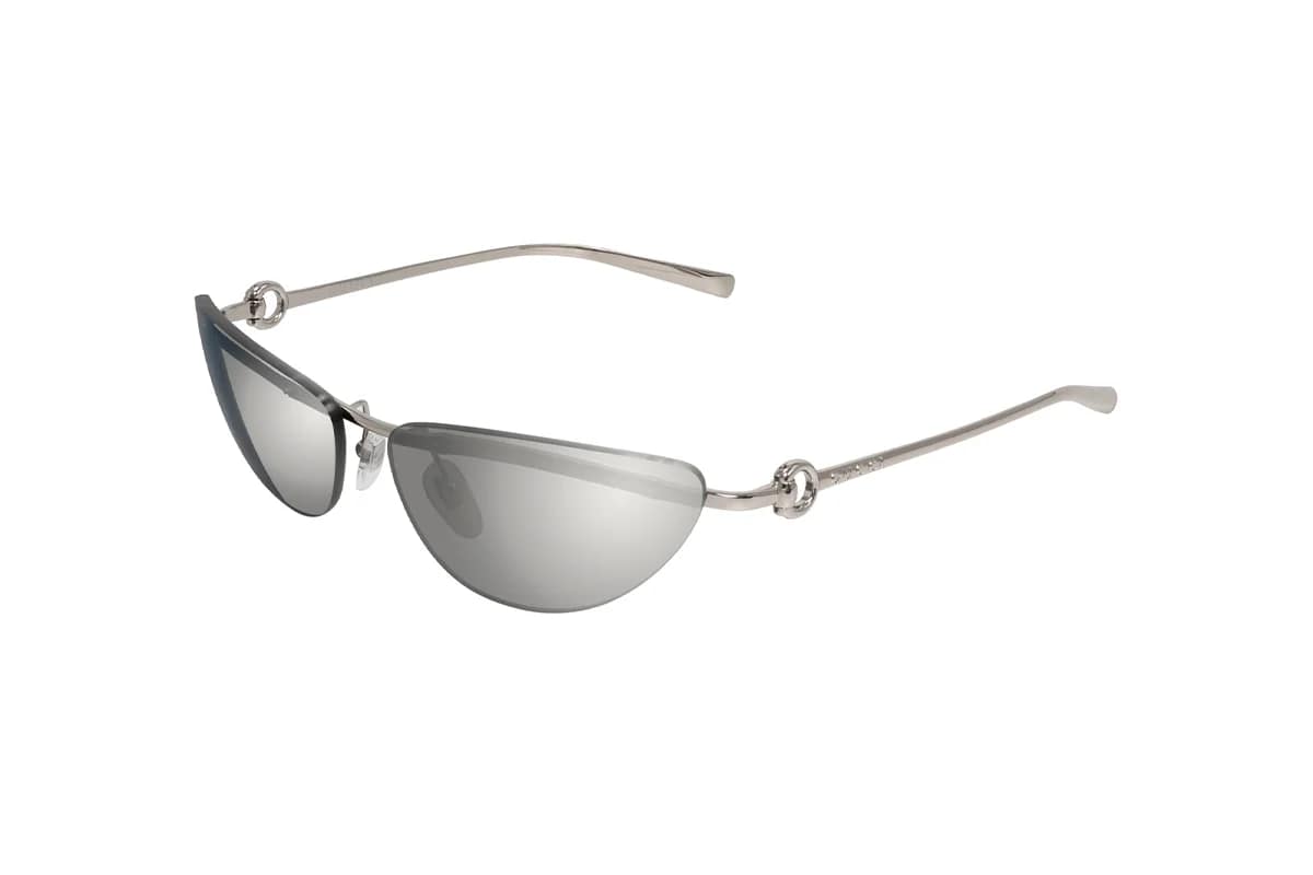 Occhiali da sole Gucci GG1701S 002 Silver Grey (Misura 61-15-125) Linea Horsebit. Montatura donna cat-eye avvolgente realizzata in metallo argento con lenti specchiate in bio nylon grigio. Concept con doppia lente glasant e struttura metallica dalle linee avvolgenti. Logo con scritta Gucci inciso al laser sulle aste.