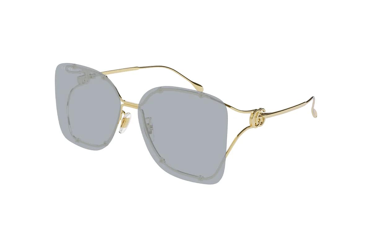 Occhiali da sole Gucci GG1713SA 001 Gold Grey (Misura 60-15-120) Linea Fork. Montatura glasant da donna squadrata oversize realizzata in metallo oro con lenti uniformi in bio nylon grigio. Modello rimless con struttura delle aste ricurva e Logo GG Interlocking sulle cerniere.