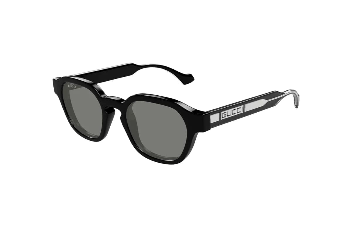 Occhiali da sole Gucci GG1730S 001 Black Crystal Grey (Misura 50-21-145) Linea Lettering. Montatura squadrata da uomo dalla forma stondata realizzata in iniettato nero e aste in resina con lenti uniformi in bio nylon grigio. Modello con logo scritta Gucci fluttuante sulle aste trasparenti.