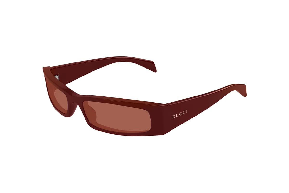 Occhiali da sole Gucci GG1778S 003 Burgundy Brown (Misura 58-17-135) Linea Fashion. Montatura rettangolare ultra stretta da uomo realizzata in acetato riciclato bordeaux con lenti uniformi in bio nylon marrone. Modello allungato ispirato agli anni ‘90, leggermente avvolgente e dalle linee decise. Logo inciso e smaltato con scritta Gucci sulle aste.