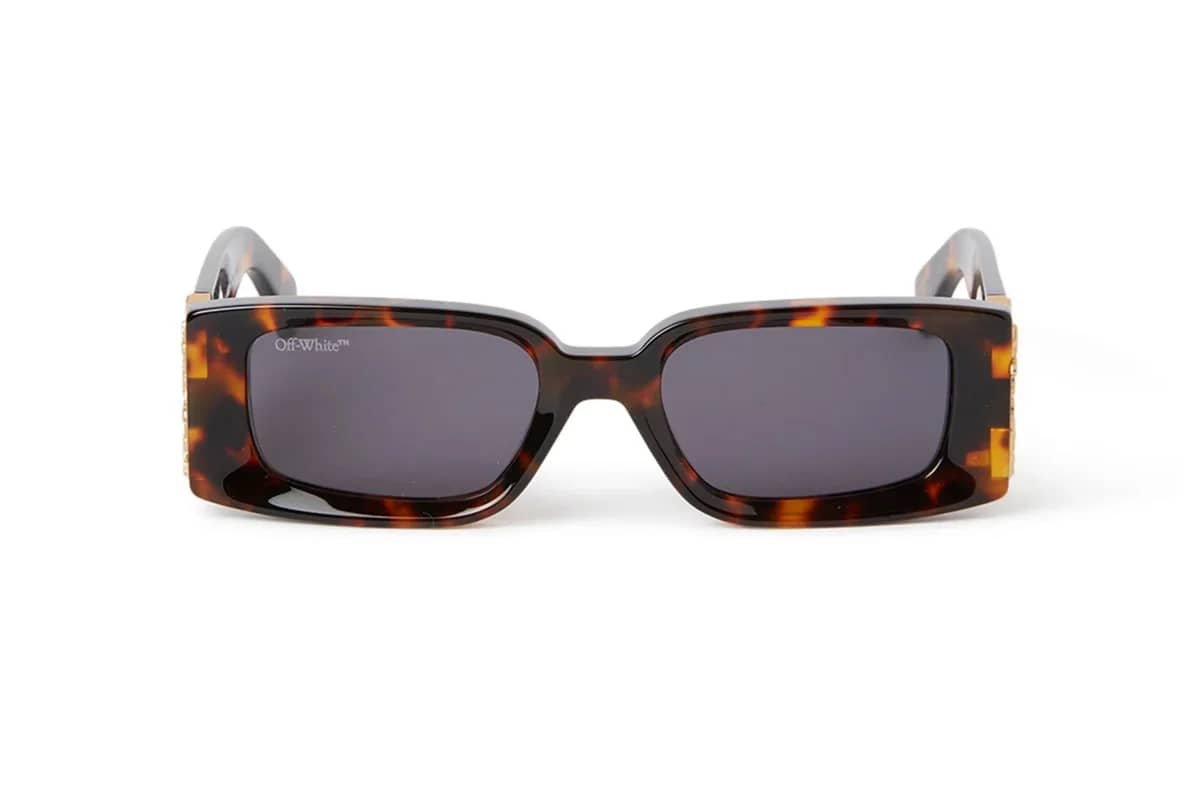 Occhiali da sole Off White Roma (misura 52-19-145). Montatura Unisex realizzata in Acetato havana con lenti in CR-39. Occhiali da sole rettangolari ideali per un viso rotondo, a diamante, ovale.