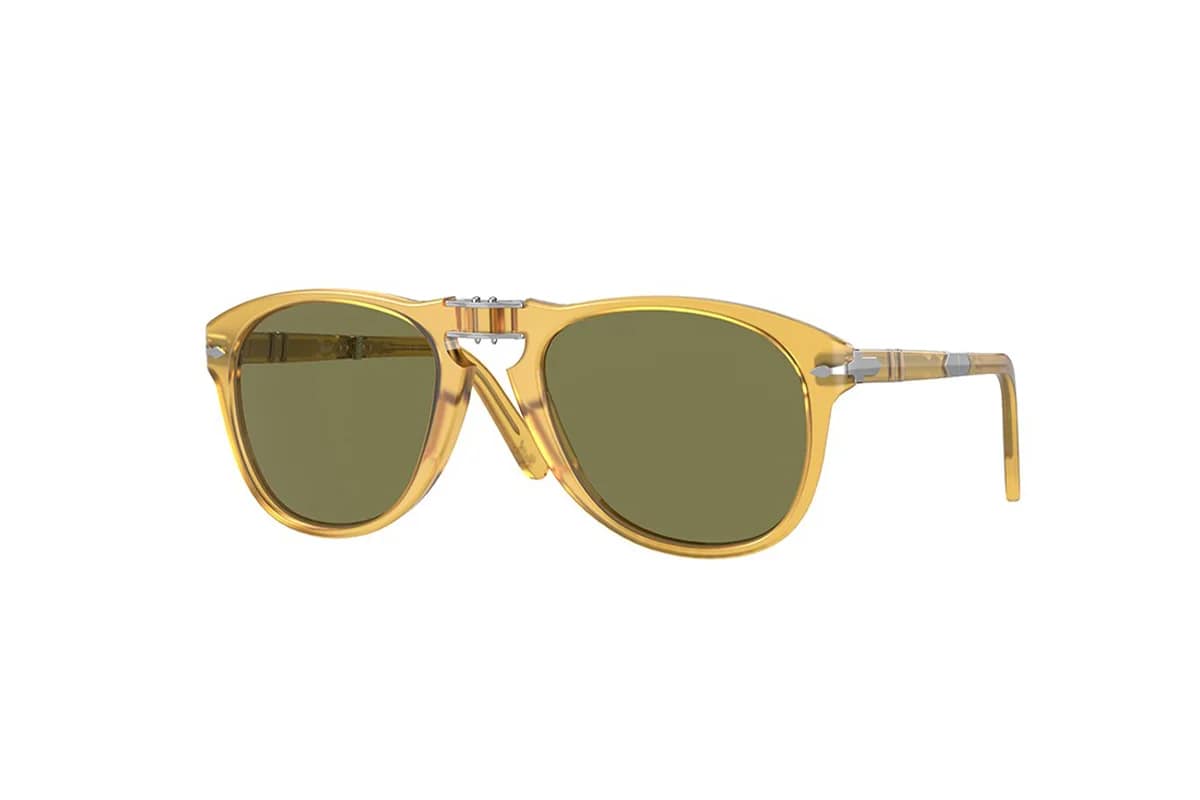 Occhiali da sole Persol Steve McQueen PO 0714 SM 204/P1 (misura 54-21-140). Montatura pieghevole realizzata in Acetato color giallo con lenti polarizzate in cristallo verde. Occhiali da sole aviator ideali per un viso squadrato, ovale, a cuore.