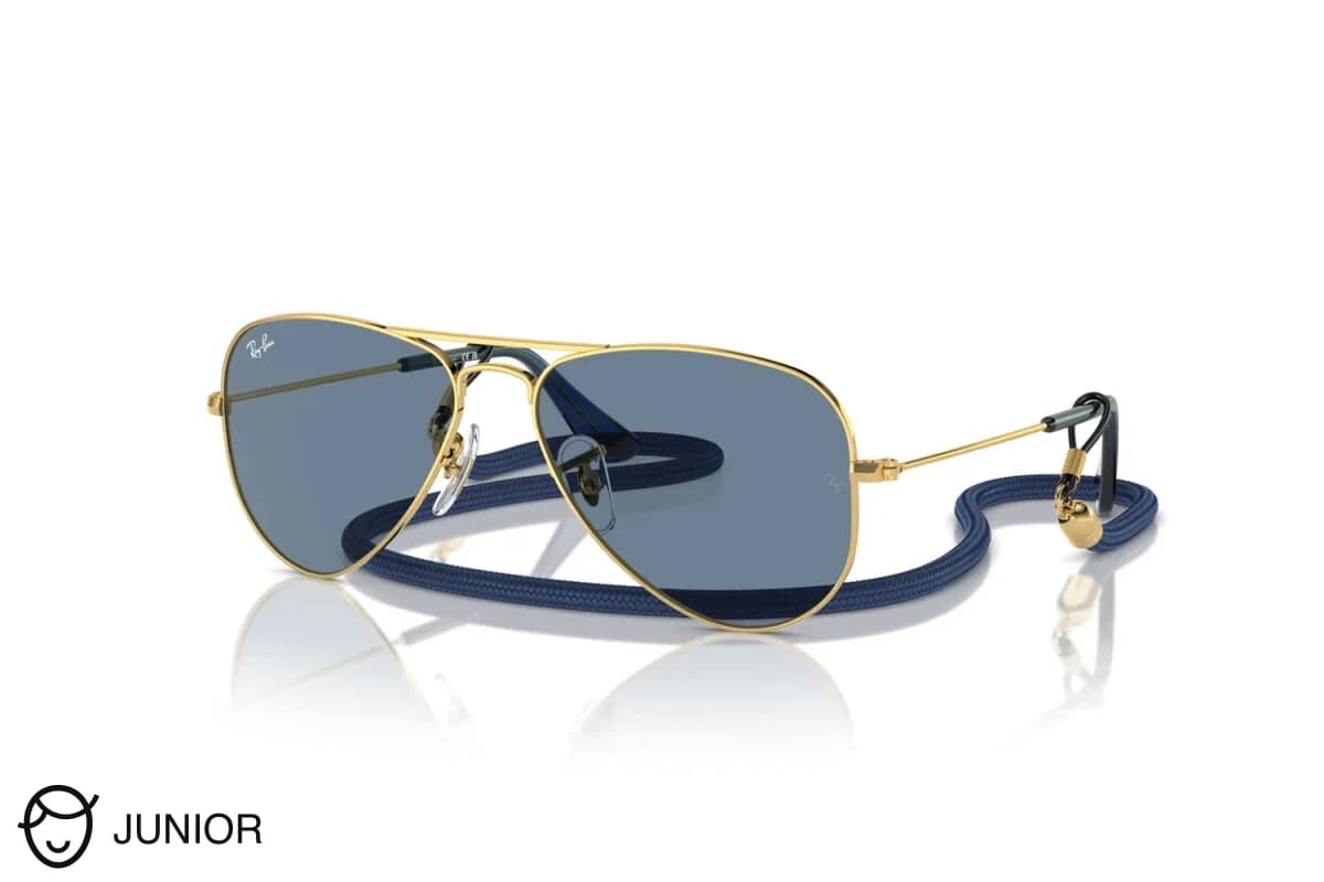 Occhiali da sole Ray Ban Junior Aviator 9506S 223/1U (Misura 52-14-125). Montatura realizzata in Metallo Oro con lenti in CR-39 colore Blu.