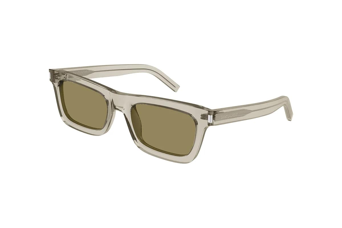 Occhiali da sole Saint Laurent Betty SL 461 021 Beige Brown (misura 54-18-145). Montatura rettangolare da donna realizzata in acetato riciclato color beige trasparente con lenti in bio nylon marrone. L’iconico modello della Maison riproposto in acetati dai toni naturali ispirati a Marrakech.