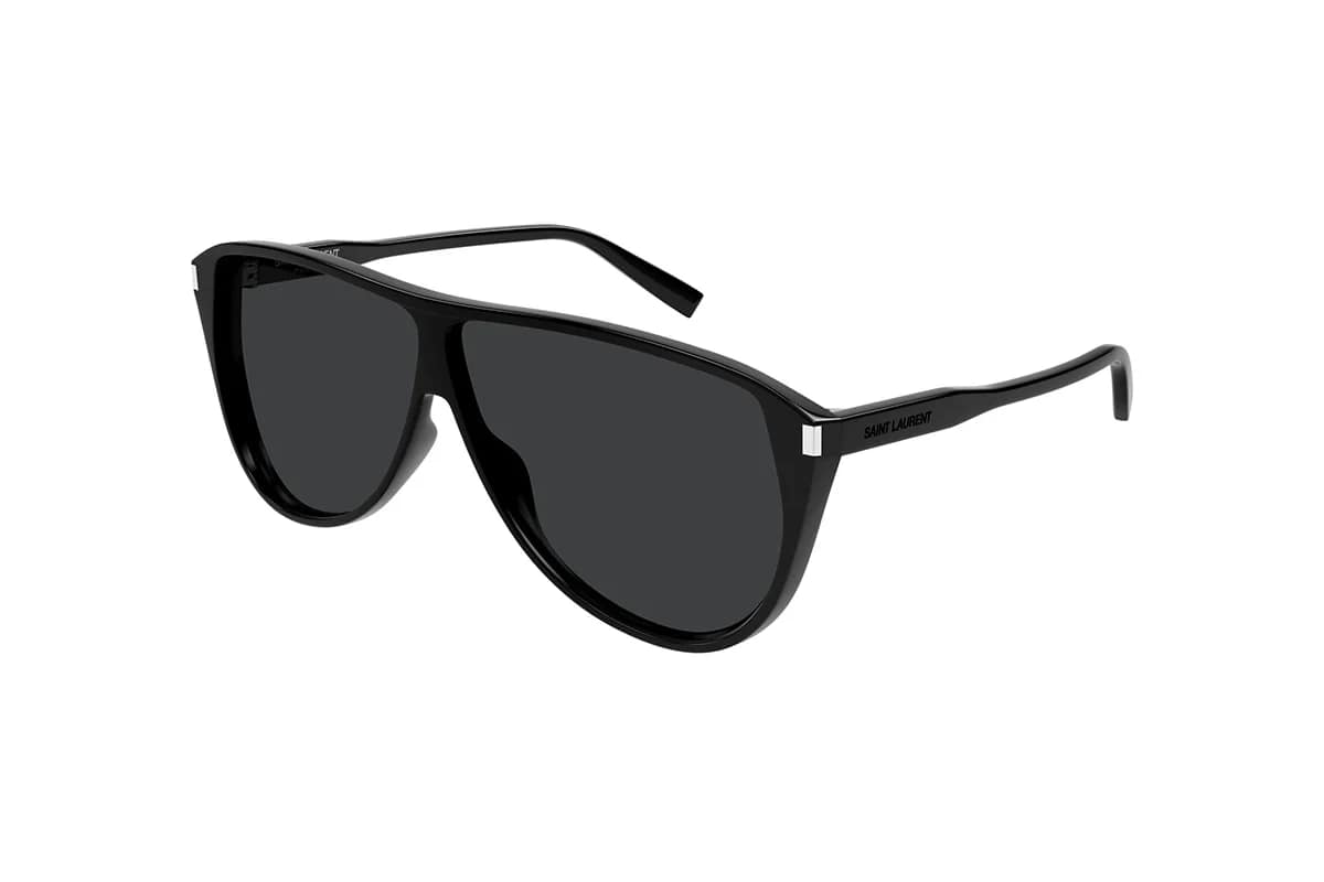 Occhiali da sole Saint Laurent SL 731 Gaspar 002 Black (Misura 65-05-145). Montatura aviator da uomo realizzata in acetato riciclato nero con lenti uniformi in bio nylon nero. Modello Pilot dalle linee fluide caratterizzato dalla struttura sottile e lenti dai colori chiari. Montatura impreziosita dall’iconico corner angle e logo inciso al laser sulle aste. Un omaggio a Gaspar Noé, noto regista argentino.