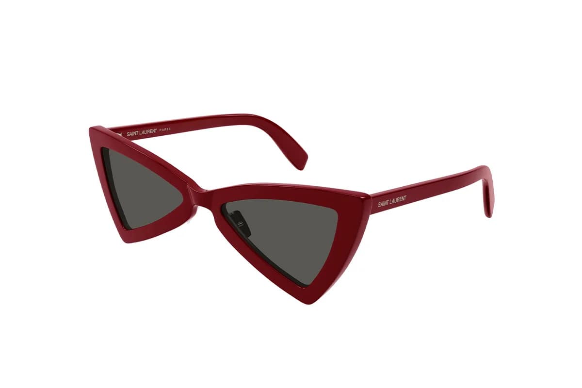 Occhiali da sole Saint Laurent Jerry SL 207 008 (Misura 53-19-145). Montatura geometrica da donna, realizzata in acetato riciclato rosso con lenti uniformi in bio nylon grigio (categoria 3). Modello “bow tie” dal taglio triangolare netto, che incarnano lo spirito glamour degli anni ’80 e l’inconfondibile look di Le Smoking: l’iconico completo androgino lanciato nel 1966 da Yves Saint Laurent. Logo Saint Laurent inciso al laser sulle aste.