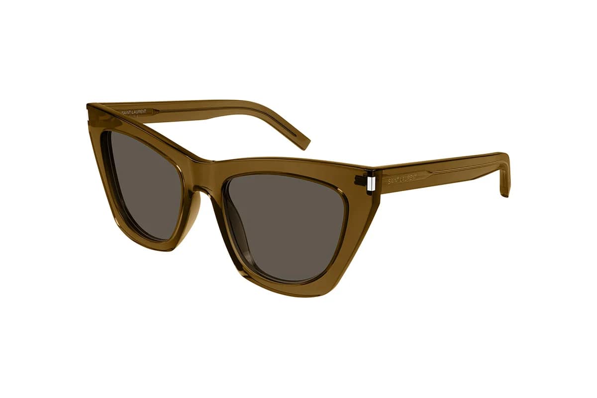 Occhiali da sole Saint Laurent SL214 034 Kate Brown, linea New Wave (misura 55-20-145). Montatura a farfalla da donna realizzata in acetato riciclato marrone trasparente con lenti uniformi in bio nylon marrone. L’iconico modello best seller della Maison riproposto in motivo palma serigrafato che richiama il mood chic hawaiano.