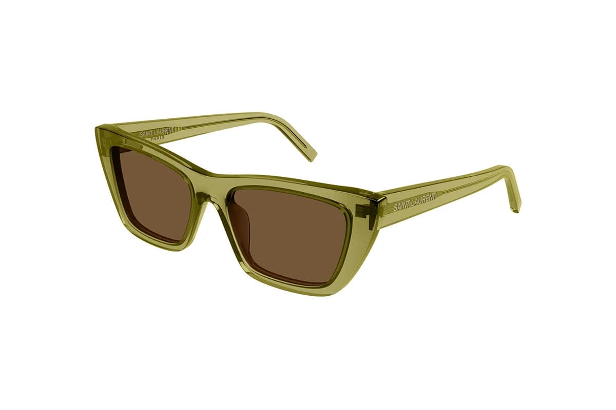 Occhiali da sole Saint Laurent Mica SL276 059 Green Brown, linea New Wave (misura 55-20-145). Montatura cat-eye da donna realizzata in acetato riciclato color verde trasparente con lenti in bio nylon marrone. L’iconico modello best seller della Maison riproposto in motivo palma serigrafato che richiama il mood chic hawaiano.