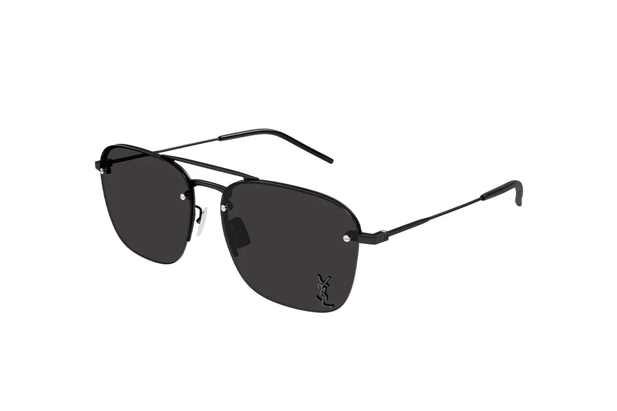 Occhiali da sole Saint Laurent SL 309 001 (Misura 56-17-145). Montatura navigator unisex, realizzata in metallo color argento con doppio ponte e lenti uniformi in bio nylon grigio (categoria 3) con monogramma YSL.