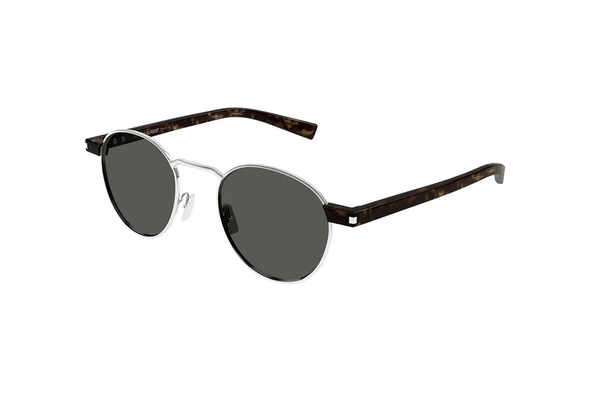 Occhiali da sole Saint Laurent SL 707 001 Silver Havana Grey (Misura 49-21-145). Montatura panthos da uomo realizzata in metallo argento e aste in bio iniettato havana con lenti uniformi in bio nylon grigio.