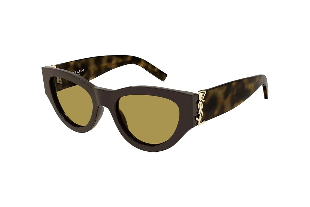 Occhiali da sole Saint Laurent SL M94 010 Brown Havana Brown (misura 53-20-145). Montatura donna realizzata in acetato riciclato marrone e havana sulle aste con lenti uniformi in bio nylon marrone. Modello caratterizzato dall’iconico logo monogram YSL sulla cerniera color oro.