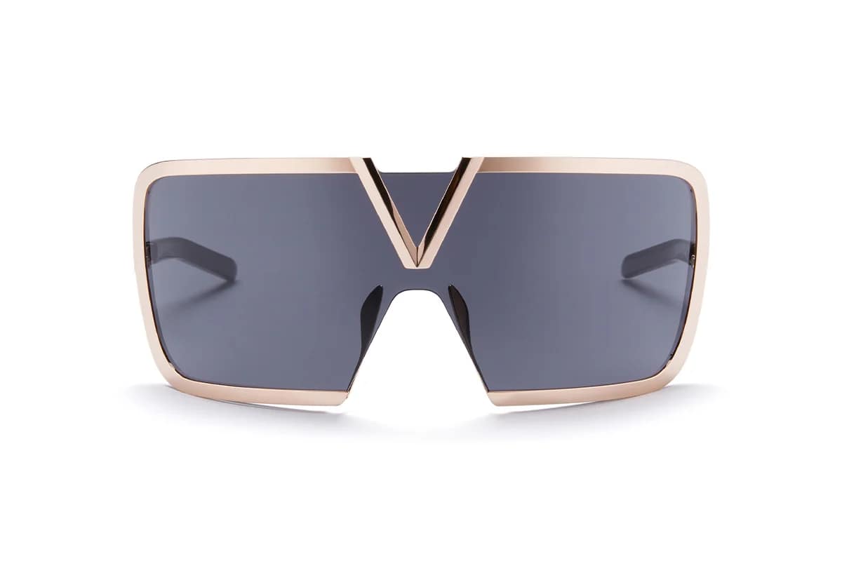 Occhiali da sole Valentino V Romask VLS-120A RSE-BLK (misura 146-118). Montatura realizzata in Titanio e Acetato Giapponese color oro con lenti in Nylon. Occhiali da sole mascherina ideali per un viso a cuore, a diamante, ovale.
