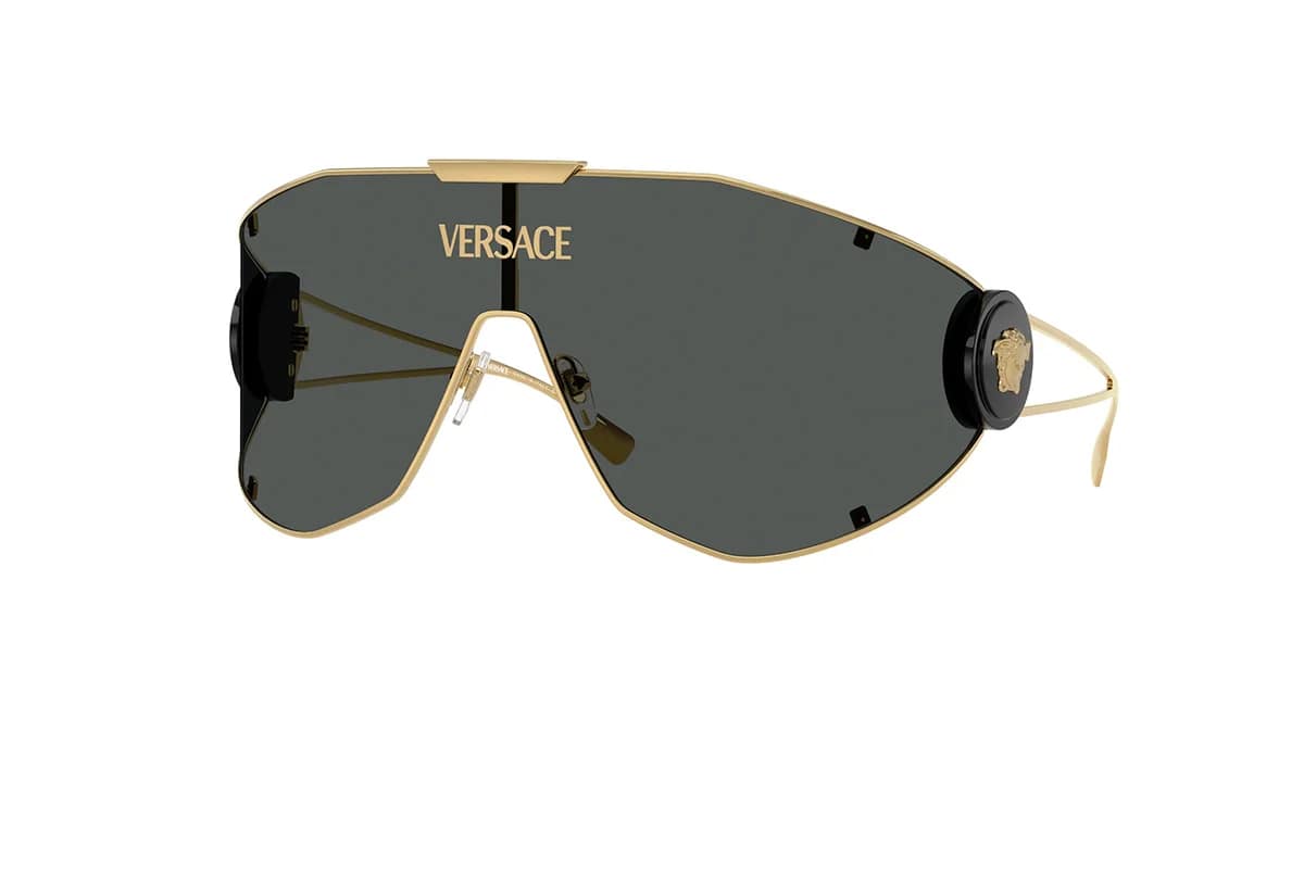 Occhiali da sole Versace VE 2268 100287 Oro (misura 42-14-115). Montatura uomo a mascherina realizzata in metallo color oro con lente uniforme in poliammide grigio scuro (categoria 3). Un design a maschera, oversize dallo stile audace con una costruzione delle lenti super-avvolgenti con simbolo Medusa in rilievo sull’asta abbinato al colore della montatura.