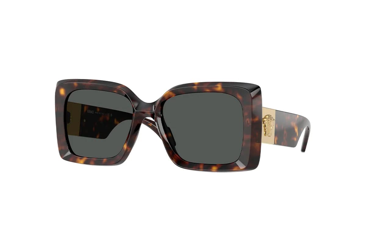 Occhiali da sole Versace VE 4467U 108/87 (Misura 54-18-140). Montatura squadrata da donna, realizzata in propionato havana con lenti uniformi in poliammide bio grigio (categoria 3). Lussuoso, elegante e senza tempo, questo modello femminile dal profilo oversize d’impatto è impreziosito da una placchetta in metallo con il logo Medusa sulle aste.